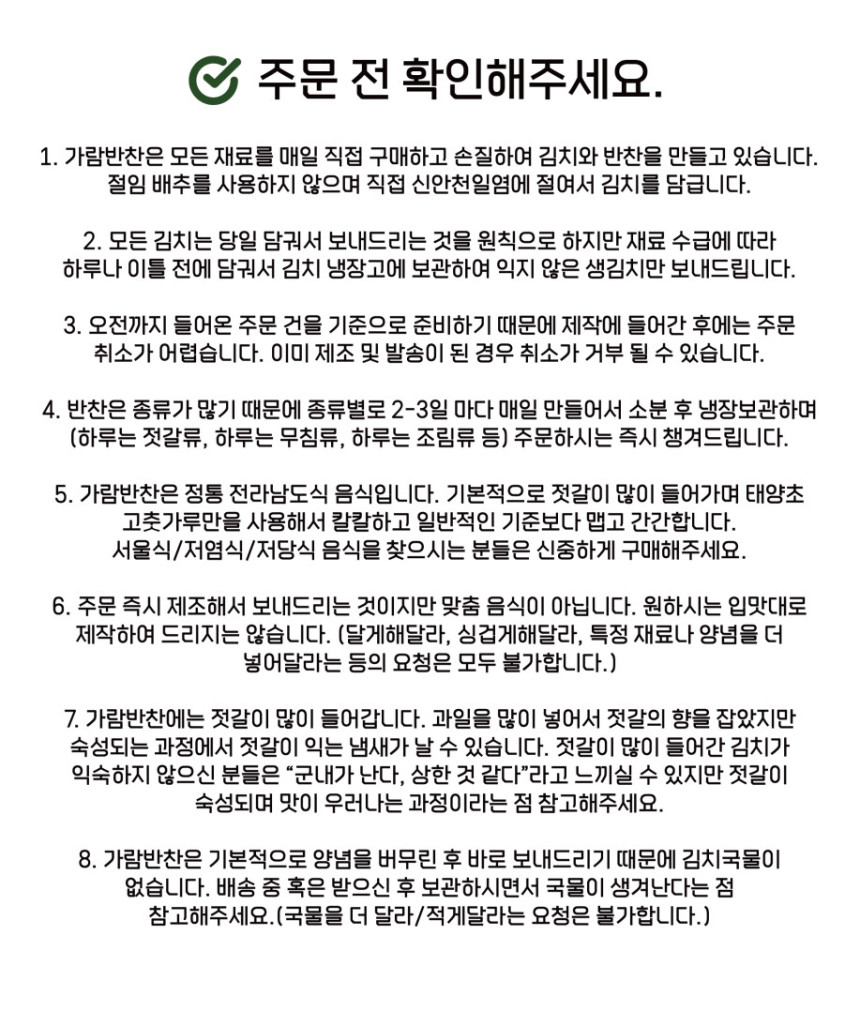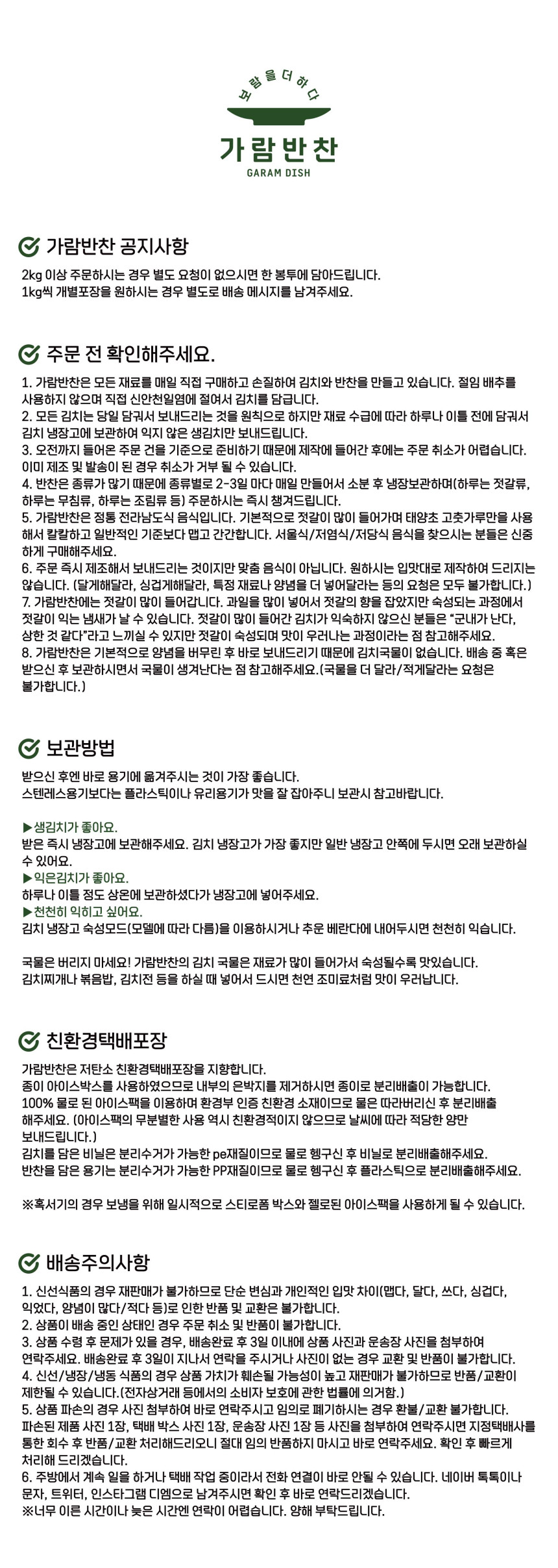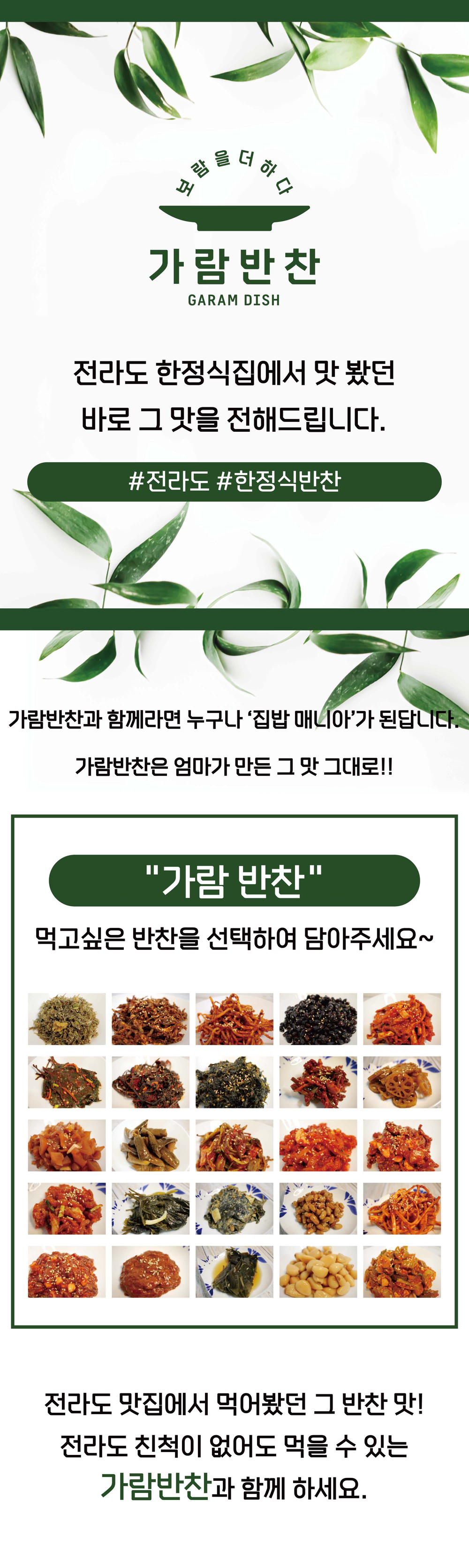 *가람반찬은 전라도식이므로 간이 조금 센편입니다. 또한 방부제가 들어가지 않은 가정식 반찬이므로 변질을 막기 위해서 약간 간간하게 만들고 있습니다.