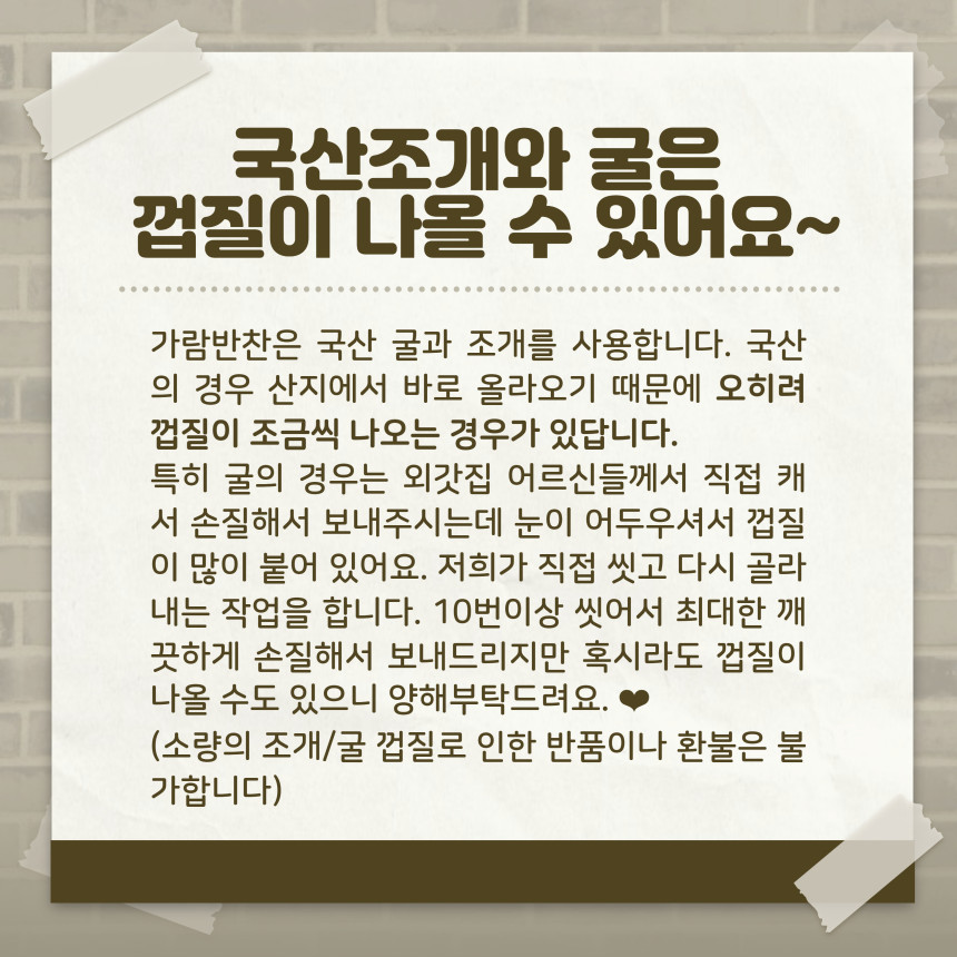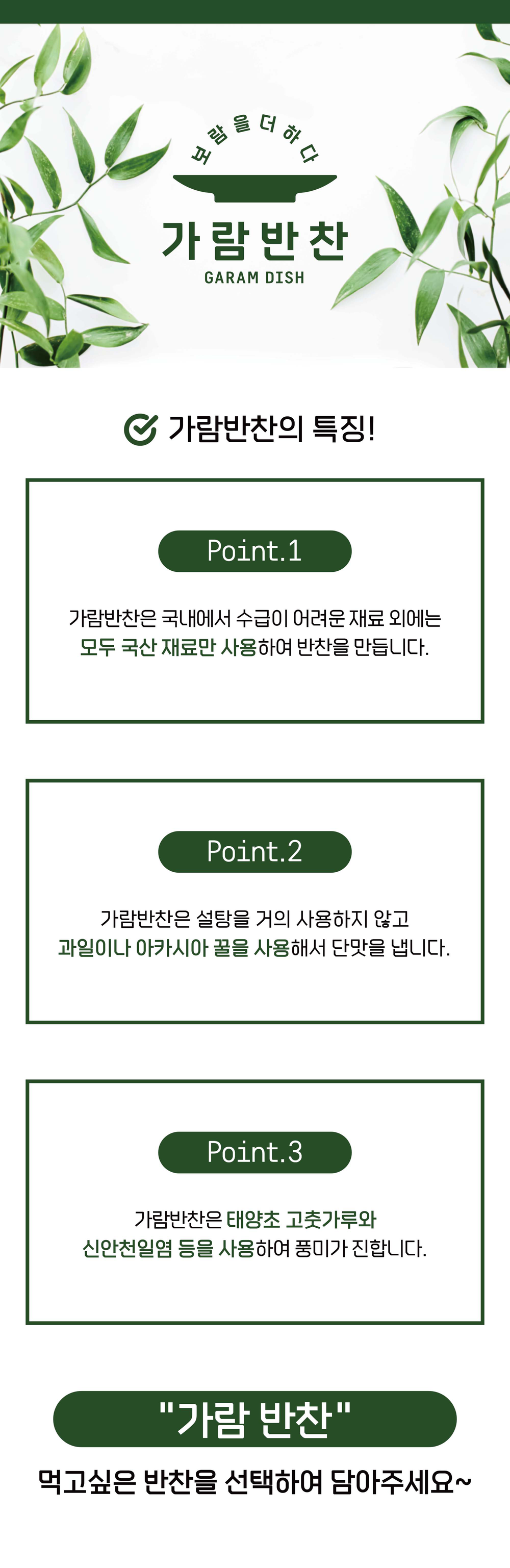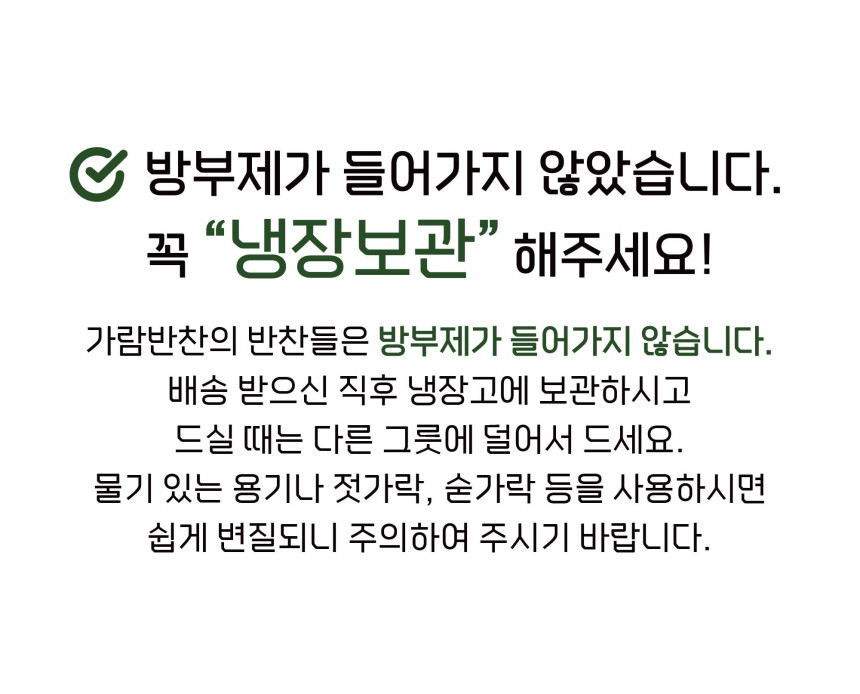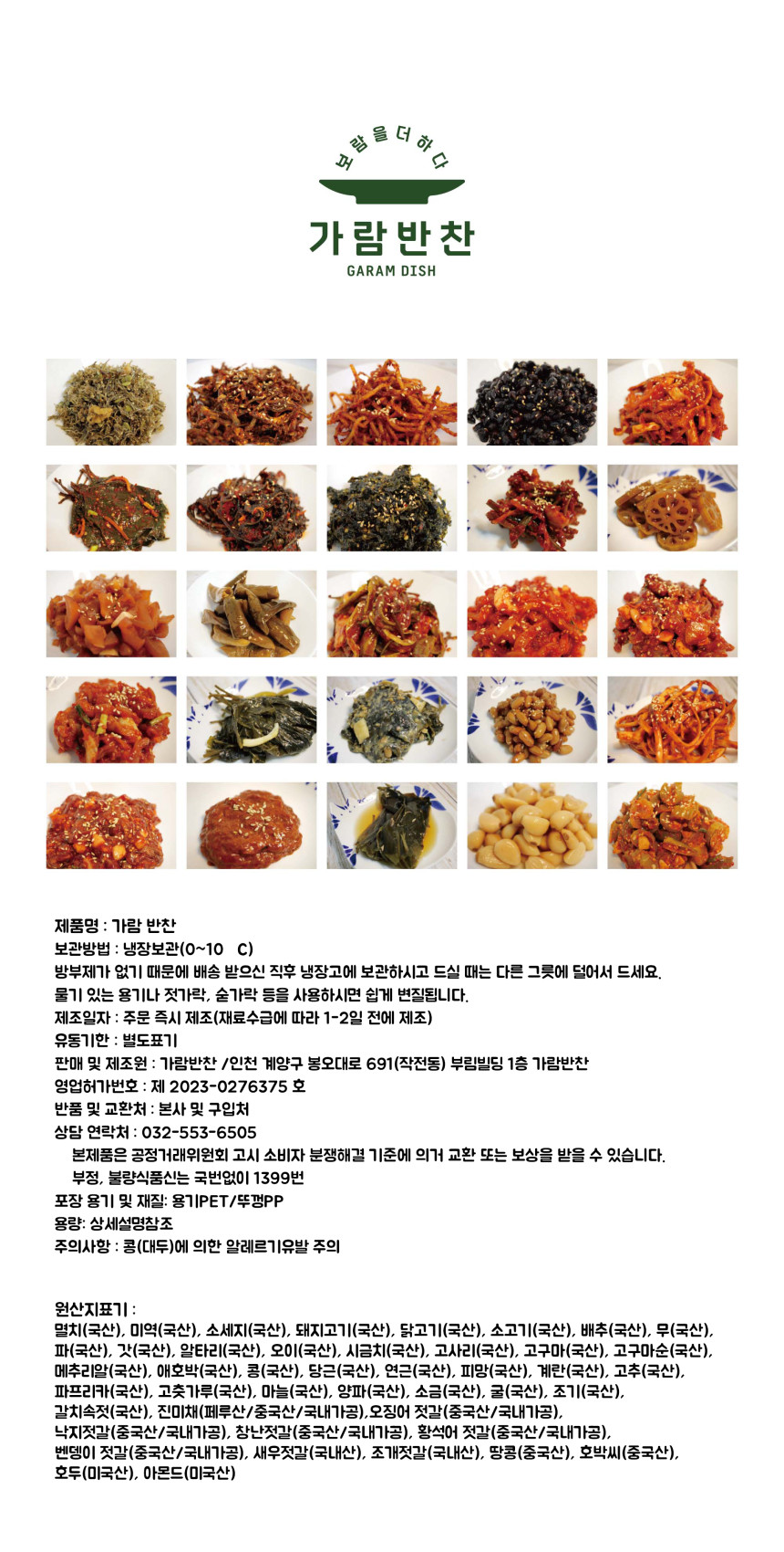 *가람반찬은 전라도식이므로 간이 조금 센편입니다. 또한 방부제가 들어가지 않은 가정식 반찬이므로 변질을 막기 위해서 약간 간간하게 만들고 있습니다.